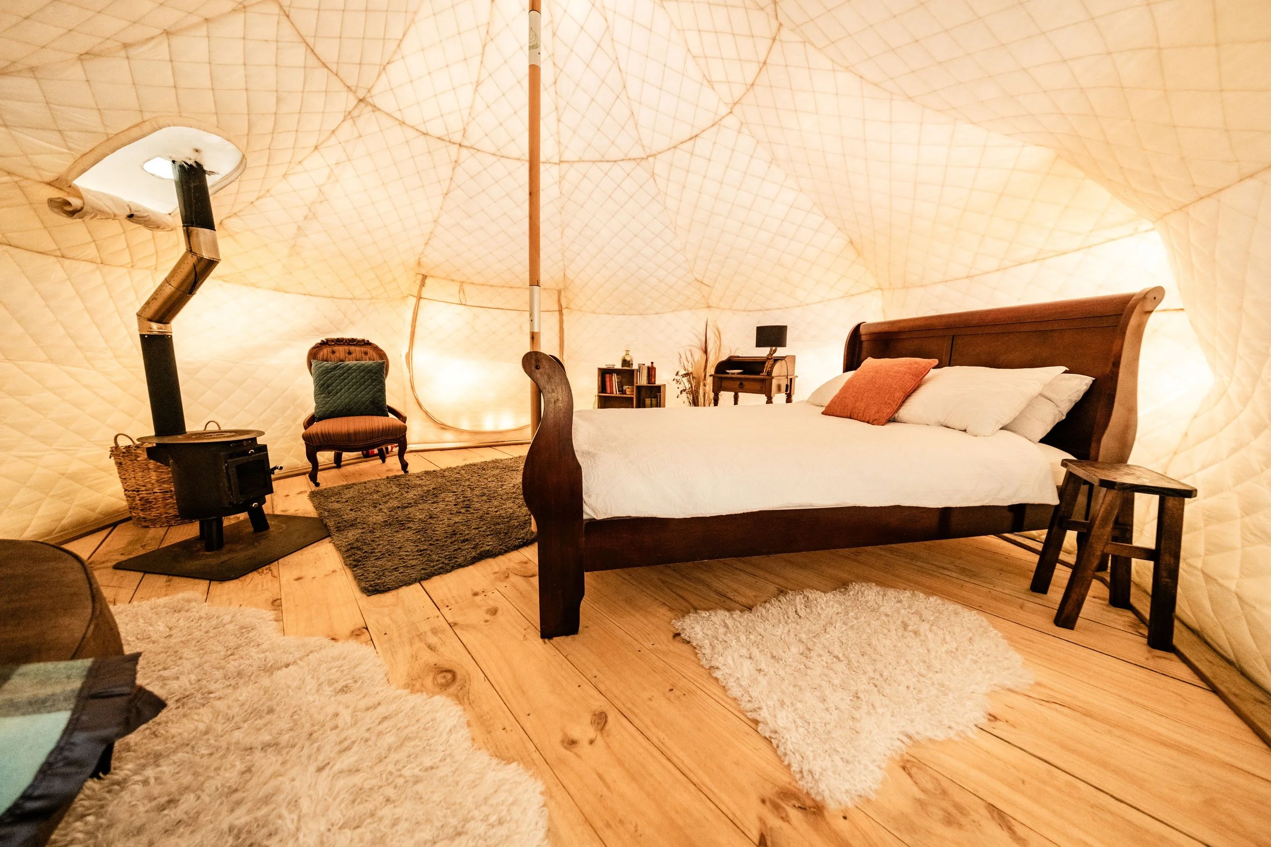 Dirt Farm’s 6 uniquely decorated, exquisitely beautiful, luxury glamping tents are available for you to stay in year round. Each tent is positioned to provide maximum privacy, with either breath taking of views of the Tararua ranges or eye fulls of Dirt Farms stunning natural vistas. Each tent has its own private, beautifully appointed ensuite bathroom and the tents themselves are fully insulated with wood fires to keep you warm and cozy on those colder winter days. All our tents contain luxuriously appointed queen beds, complete with delicious quality linen, blankets for those colder night and everything else you will need for an experience like no other. For those looking for just a little more space, Tauhou has the addition of a second star gazer tent which allows you to sit in front of the fire and take in the beautiful night sky, while away the time playing games or chat in the wee small hours, all the while surrounded by nature.