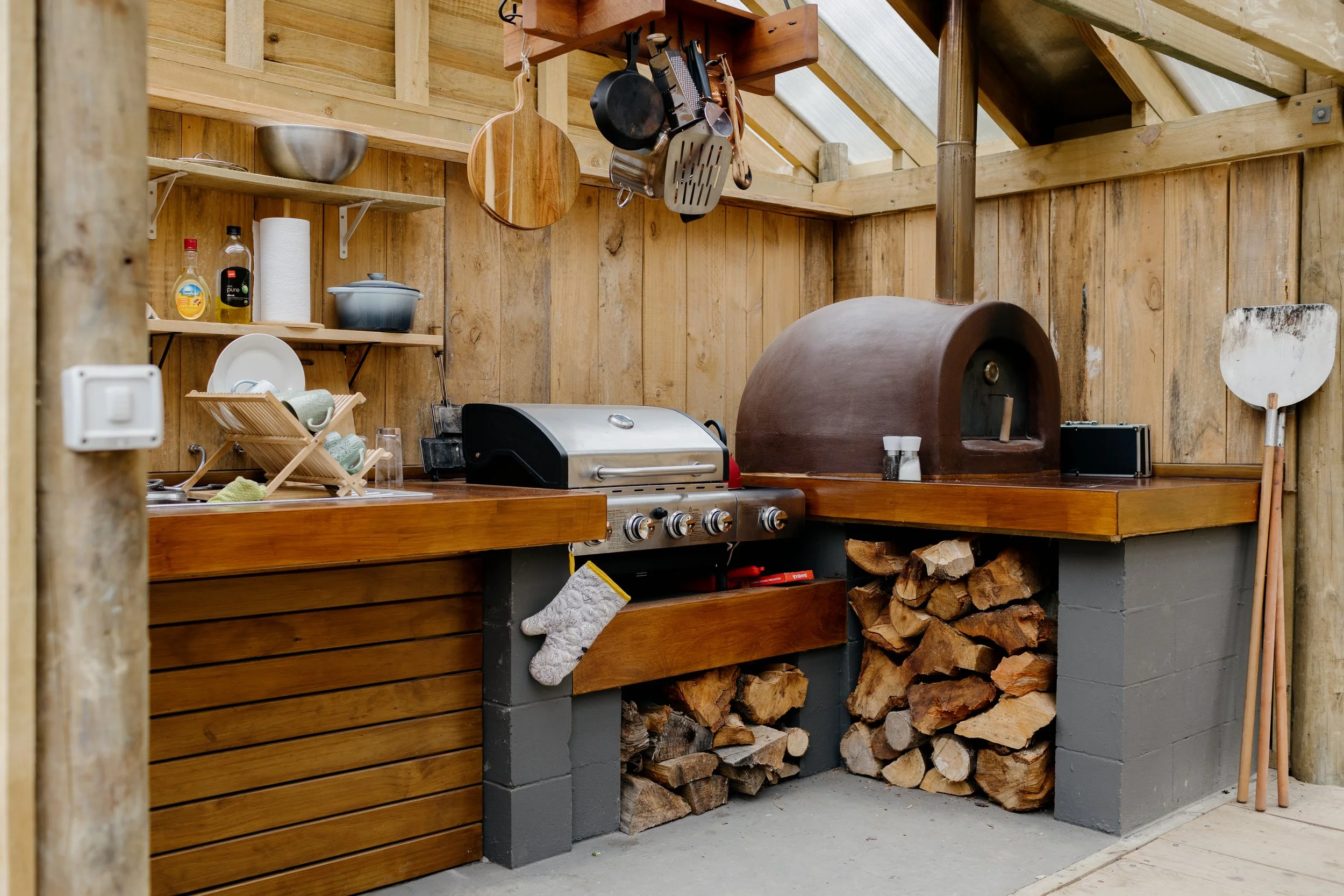 Our communal glamp kitchen has everything you will need for your stay, including a large quality bbq, traditional wood fired pizza oven, utensils, croquery, pots, pans and of course the kitchen sink. Sit by the wood fire and enjoy a book or on those warm summer days, head out onto the lawn and take in some late afternoon sun.